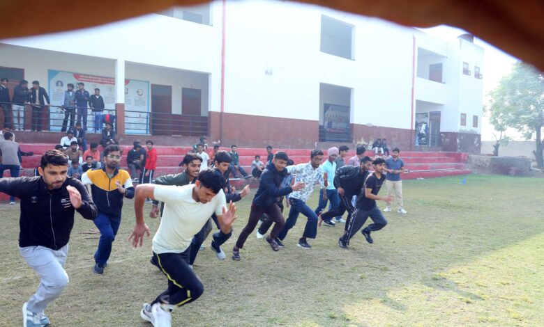 खेल महोत्सव के प्रथम दिन विभिन्न रोमांचक एवं मनोरंजक प्रतियोगिताओं का आयोजन किया गया। महाविद्यालय प्राचार्य डॉ विशाल पारीक ने कहा कि उक्त खेल महोत्सव के तहत सातों दिन अलग-अलग तरह की प्रतियोगिताएं होंगी जिसमें महाविद्यालय के सभी विद्यार्थी अलग अलग खेलो में भाग लेंगे। आज प्रथम दिन रिले रेस, सैक रेस, 100 मीटर दौड़, थ्री लेग रेस सहित अन्य खेल स्पर्धाएं शामिल रहीं। इन प्रतियोगिताओं में विद्यार्थियों ने बढ़-चढ़कर भाग लिया और अपनी शारीरिक क्षमता, टीम भावना तथा अनुशासन का परिचय दिया। दर्शकों ने भी तालियों की गड़गड़ाहट के साथ खिलाड़ियों का उत्साह बढ़ाया।