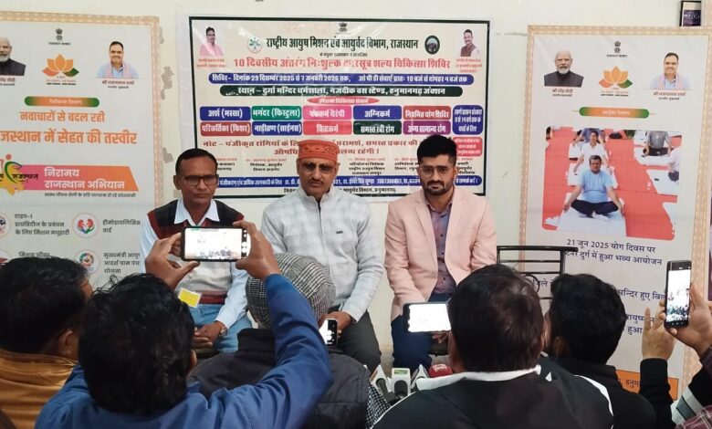 हनुमानगढ़, 28 दिसम्बर। राष्ट्रीय आयुष मिशन एवं आयुर्वेद विभाग के संयुक्त तत्वावधान में 29 दिसम्बर 2025 से 7 जनवरी 2026 तक दस दिवसीय निःशुल्क क्षारसूत्र अंतरंग शल्य चिकित्सा शिविर का आयोजन किया जा रहा है। इसी सिलसिले में रविवार को जंक्शन स्थित जिला सूचना एवं जनसंपर्क कार्यालय में आयुर्वेद उपनिदेशक डॉ. तीर्थ शर्मा ने प्रेस कॉन्फ्रेंस के माध्यम से जानकारी दी। इस अवसर पर डॉ. डी.सी. सारस्वा व डॉ. राजन सेतिया उपस्थित रहे।