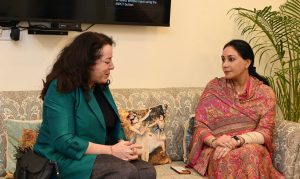जयपुर, 3 फरवरी। उप मुख्यमंत्री दिया कुमारी से सोमवार को उप मुख्यमंत्री कार्यालय में स्विस राजदूत माया तिस्साफी ने शिष्टाचार मुलाकात की। इस दौरान राज्य सरकार एवं स्विस सरकार के संयुक्त तत्वावधान में प्रदेश में पर्यटन को बढ़ावा देने के लिए शॉर्ट टर्म स्किल डवलपमेंट कोर्स संचालित करने, एडवेंचर ट्यूरिज्म को बढ़ावा देने में सहयोग करने पर विस्तृत चर्चा हुई। इसके साथ ही ट्रेफिक मैनेजमेंट, वेस्ट मैनेजमेंट, सैनिटेशन आदि क्षेत्रों में तकनीकी सहयोग पर भी दोनों के बीच में सकारात्मक चर्चा हुई।