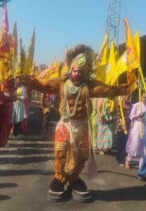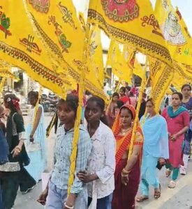 ऐलनाबाद,25 फरवरी( रमेश भार्गव) शहर के ममेरा रोड स्थित सिद्ध पीठ श्री श्याम मंदिर का फाल्गुन मेला के आज दूसरे दिन शहर के रेलवे रोड स्थित दुर्गा मंदिर से विशाल शोभा यात्रा व कलश यात्रा निकाली गई, जो कि शहर की अनाज मंडी से होती हुई पंचमुखी चौक,ममेरा चौक, गांधी चौक, चौधरी देवीलाल चौक,नमस्ते चौक होती हुई शाम को श्री सिद्ध पीठ श्याम मंदिर में पहुंची lशोभायात्रा में विभिन्न देवी- देवताओं की मनमोहक झांकियों का बहुत ही सुंदर प्रदर्शन किया गया,सैकड़ो महिलाएं अपने सिर पर पवित्र कलश धारण किए हुए चल रही थी वहीं,पुरुष सदस्यों ने अपने हाथों में पीली धर्म ध्वजा उठा रखी थी. झांकियों में गणेश जी,शिव पार्वती, हनुमान जी, राम -सीता की झांकी बहुत ही मनमोहक लग रही थीl शोभायात्रा का विभिन्न चौक- चौराहों पर लोगों द्वारा भव्य स्वागत किया गया.लोग छोटू छतों पर खड़े होकर पुष्प वर्षा कर रहे थे. महिलाएं व पुरुष डफ की ताल पर झूम झूम कर नाच रहे थे.