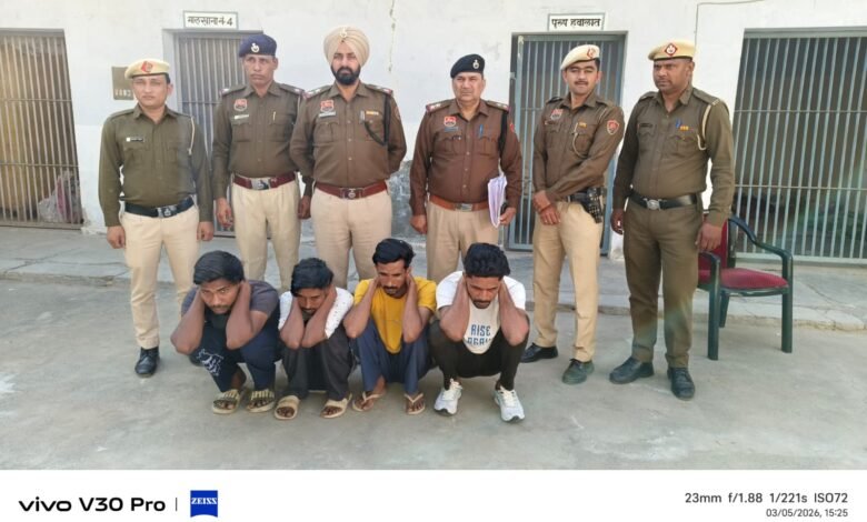 ऐलनाबाद, 5 मार्च (रमेश भार्गव) ऐलनाबाद थाना पुलिस ने बड़ी सफलता हासिल करते हुए वृद्ध महिला से चाकू की नोक पर लूट की वारदात का पर्दाफाश करते हुए चार आरोपियों को गिरफ्तार किया है। ऐलनाबाद पुलिस ने आरोपियों के कब्जे से लूटी गई सोने की बालियां तथा वारदात में प्रयुक्त मोटरसाइकिल भी बरामद कर ली है। इस संबंध में जानकारी देते हुए अतिरिक्त पुलिस अधीक्षक फैसल खान ने बताया कि पुलिस अधीक्षक दीपक सहारन के निर्देशानुसार जिले में अपराधियों के खिलाफ विशेष अभियान चलाया जा रहा है। इसी अभियान के तहत ऐलनाबाद थाना पुलिस की एक विशेष टीम ने त्वरित कार्रवाई करते हुए इस लूट की वारदात का खुलासा किया।